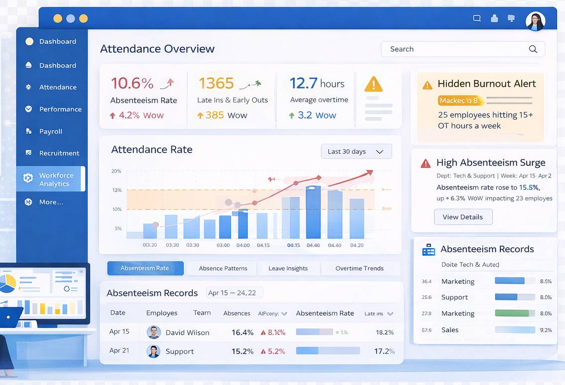 With AI-backed alerts and dashboards, HR teams can proactively manage burnout, staffing shortages, late-coming trends, and workforce discipline without manual tracking or spreadsheets.
