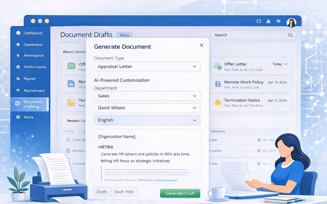 Drafting HR documents no longer requires hours of formatting, rewriting, and compliance checks. With Draft with AI in Hrtrix, HR teams can instantly generate personalized offer letters, appraisal letters, separation notices, and organizational policies with just a few clicks — saving valuable time and ensuring standardization across the organization.